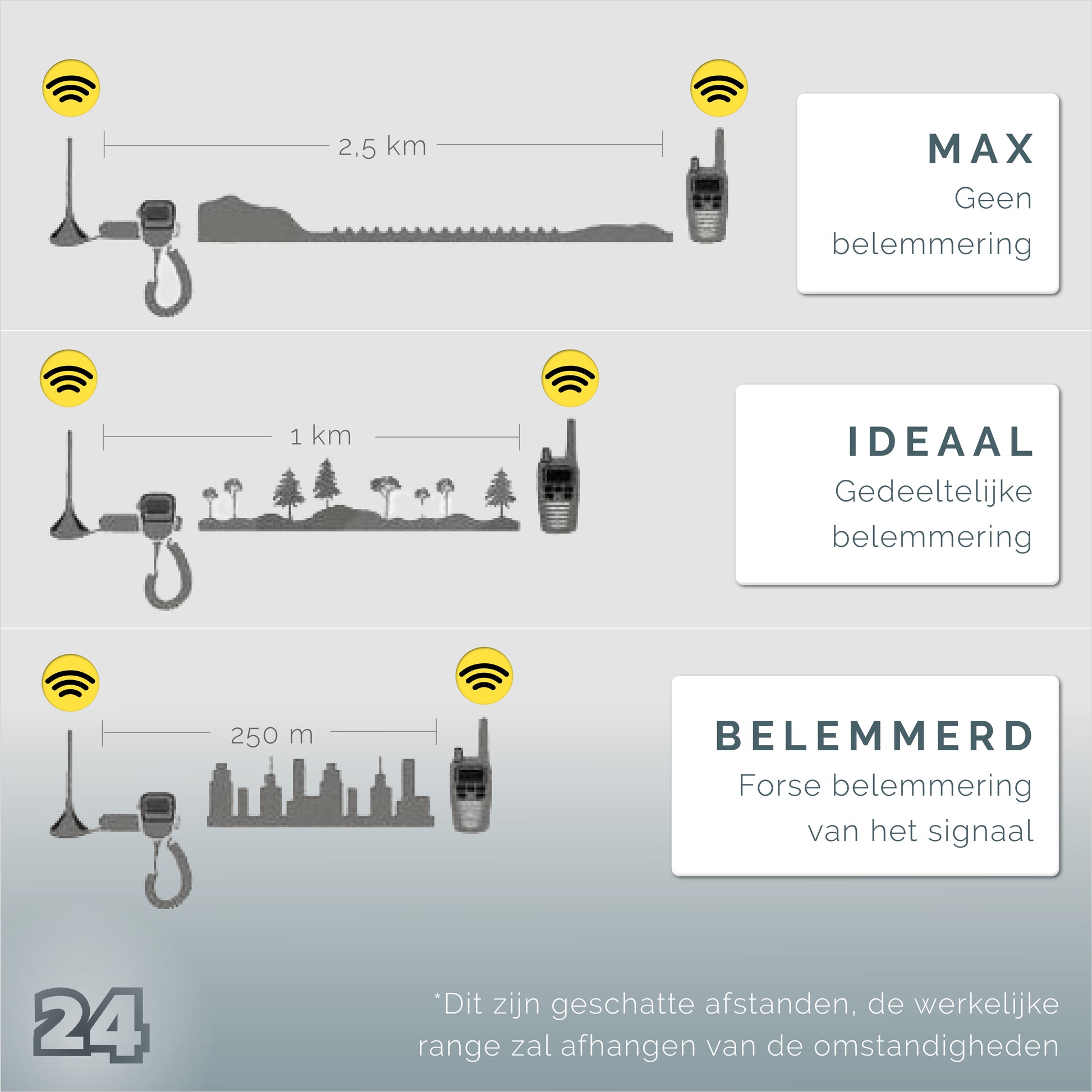 Let op : het bereik van portofoons is sterk afhankelijk van omgevingsfactoren. Buiten in het vrije veld kunnen veel grotere afstanden overbrugd worden dan binnen met betonnen muren of in staalconstructies.