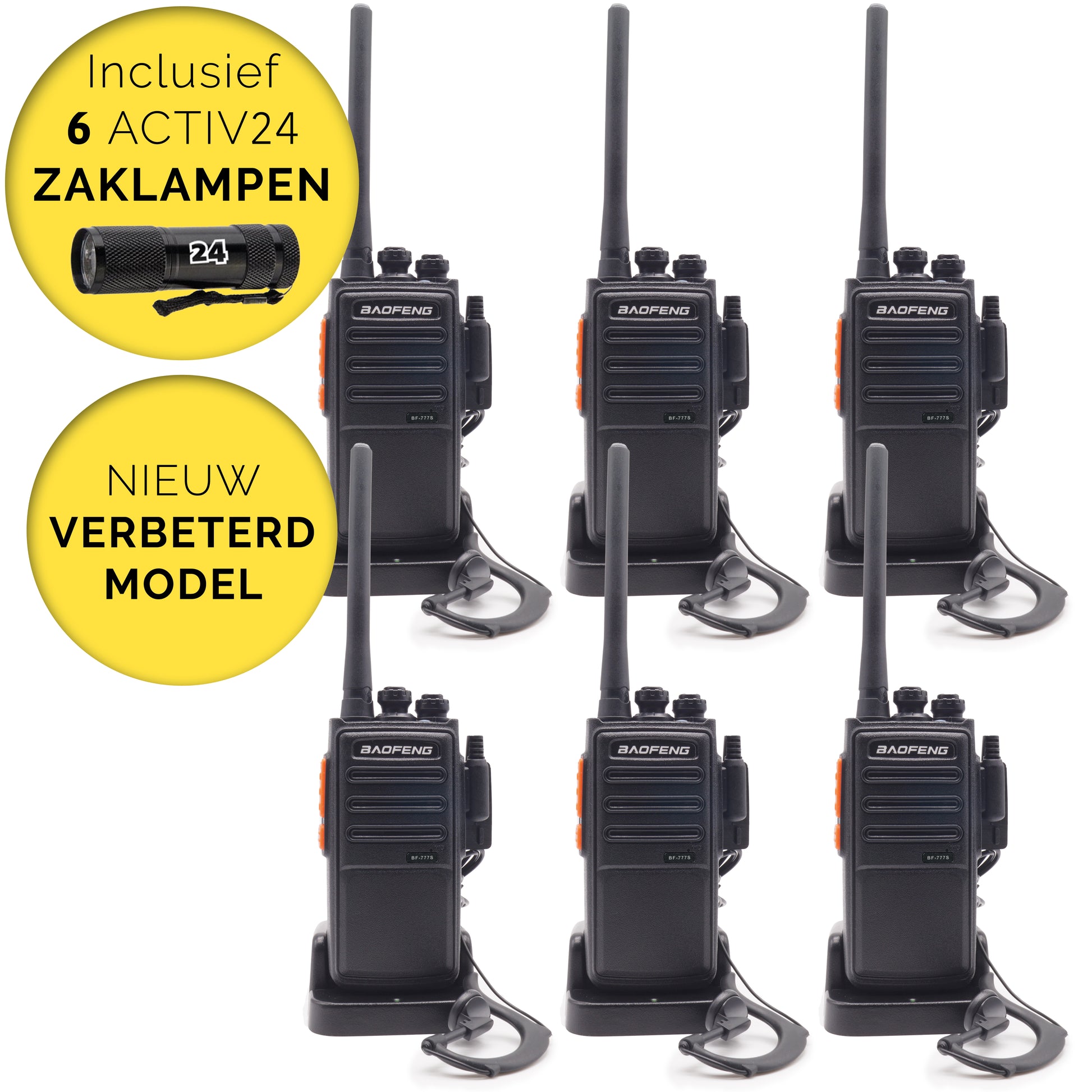 Nieuw model en verbeterde professionele Activ24 / Baofeng portofoon set, kant en klaar voor gebruik op de vrijgegeven PMR frequenties compatible met Kenwood PMR frequenties. Voorzien van de laatste software en sterkere accu. Set van 6 portofoons met accessoires plus een Activ24™ LED zaklamp per walkie talkie. Solide, compact en allround inzetbaar.